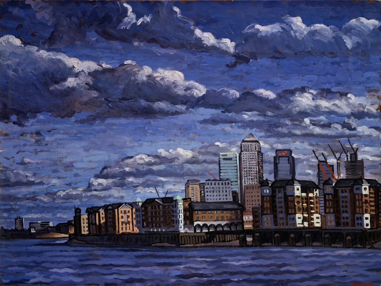 Where in recent years the Thames has been marginalised, or treated as a pretty conceit in the purlieus of “dockside development”, Paul Simonon reasserts its majesty and its pre-eminence. His compositions are modulated by its curve and flow, so that the Thames becomes the forming and informing principle of the city itself. It is the principle of life and light. The sea and the sky are intimately connected, so that it becomes a light and open city, a world away from the nineteenth century vision of darkness and labour.
