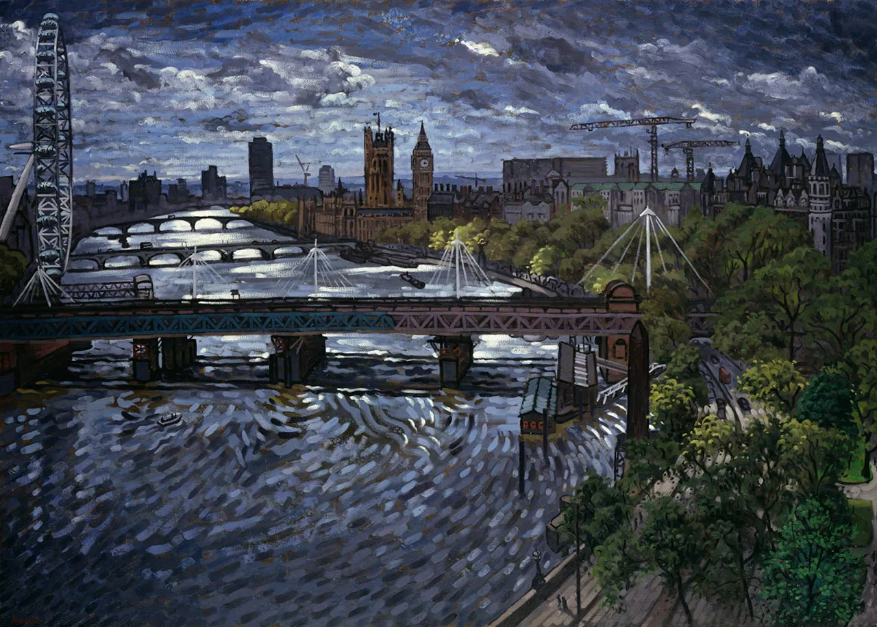 In his paintings all reverine things work in harmony: the buildings, the streets, the people, the vehicles, all are part of a living and endlessly expanding pattern. Even the vapour trails of the aeroplanes, and the flight paths of the river birds, celebrate the unity and the harmony of the great city below. The bridges are often in the foreground of his compositions, suggesting the human taming and tending of the river. They truly seem to be bridges of contentment.